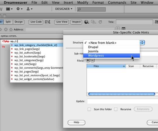 The Dynamically-Related Files feature lets you discover all of the external files and scripts necessary to assemble PHP-based Content Management System (CMS) pages, and displays their filenames in the Related Files toolbar. By default Dreamweaver supports file discovery for the WordPress, Drupal, and Joomla! CMS frameworks.